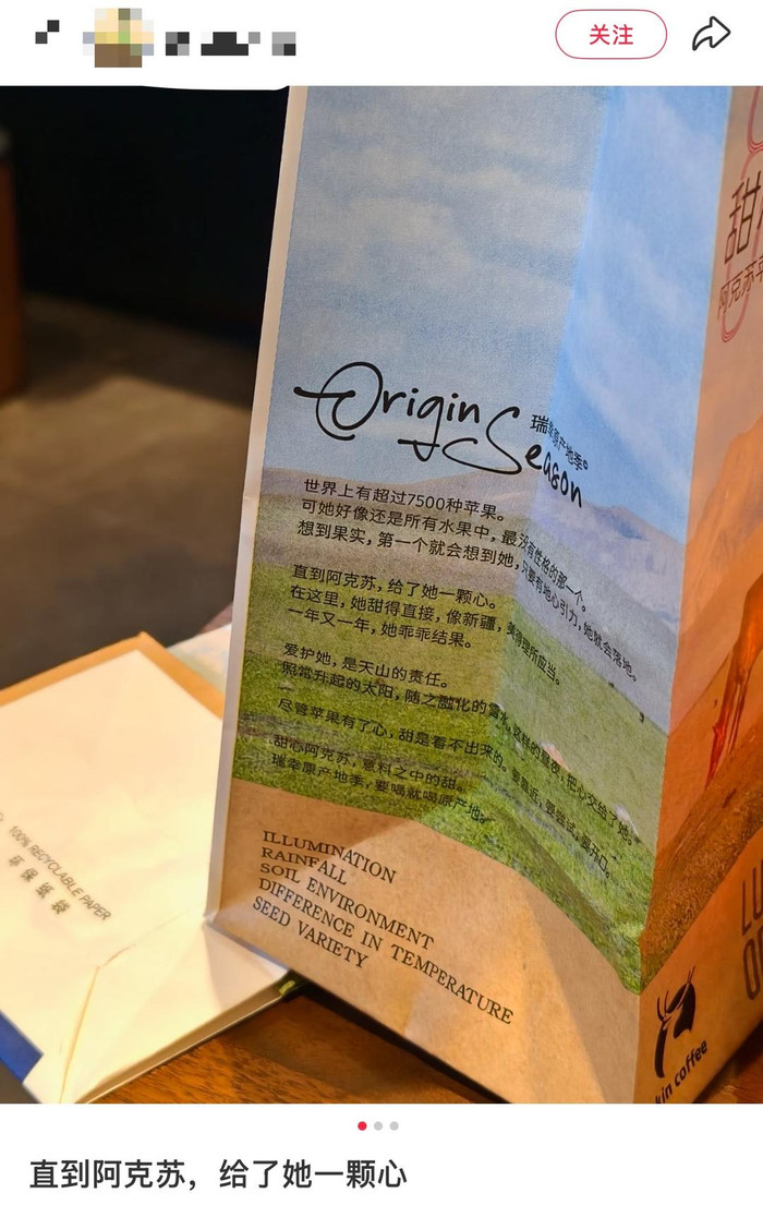 这能不能上升到直接评价女性,值得思考。正如有网友所言,“她”除了代指第三者的女性,也可用于称呼美好的事物或者自己敬重、热爱和珍视的事物。文案中说,“直到阿克苏,给了她一颗心”,阿克苏是地名,苹果是水果,组合在一起恐怕难说是一种性别叙事,倒更像一种农业叙事——作为水果的一种,阿克苏苹果声名远播,是当地的农业名片,含糖度超过普通苹果,形成糖心的概率更高。瑞幸文案围绕咖啡新品采用的原料特点进行创作,表达珍视之意,用“她”字代称,并不过分。